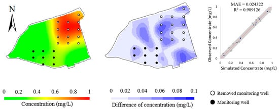 Simulated concentrations (left column), their differences from observed concentrations (middle column), and scatters of simulated versus observed concentrations (right column) obtained by removing the 13 monitoring wells in the north of the study area.