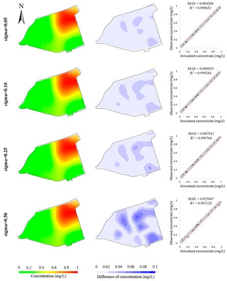 Comparisons of model calibration resulting from the calibration targets with different levels of Gaussian noise (Sigma/: standard deviation of the Gaussian noise added to calibration targets). Simulated concentrations (left column); differences from observed concentrations (middle column); scatters of simulated concentrations versus observed concentrations (right column) in real case.