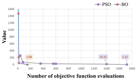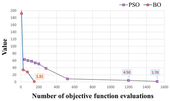 Comparison of objective function values and the associated known minima during the BO and the PSO iteration processes in real case.