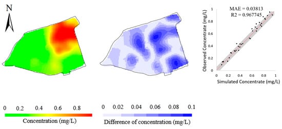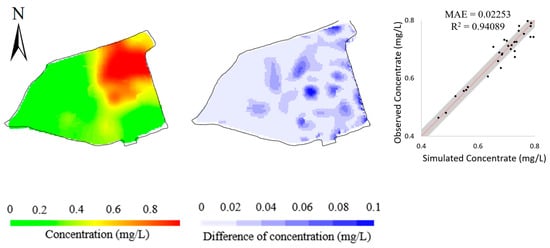 Simulated concentrations (left column), their differences from observed concentrations (middle column), and scatters of simulated versus observed concentrations (right column) obtained by removing the 23 monitoring wells in the north of the study area.