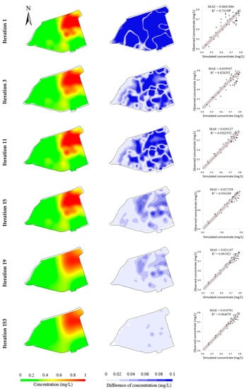 Evolution of simulated concentrations (left column), their differences from observed concentrations (middle column), and scatters of simulated versus observed concentrations (right column) during the BO process in real case.