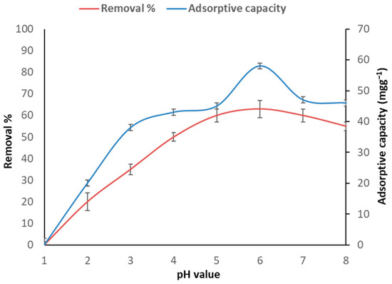 The bio-adsorption capability was highly dependent on pH, as shown in Figure 1. The optimal pH for adsorption at 100 gL−1 arsenic, 1 g bio-adsorbent, and a 120 min incubation was determined using a pH range of 1–8. The bio-adsorption rate was limited at an initial pH of 3.0 and reached a maximum at an optimal pH of 6.0, with a bio-adsorption rate of 58 mgg−1; the removal percentage was 63%. According to Abdel-Raouf and colleagues, determining the optimal pH has a significant impact on regulating the metal aqueous and functional groups of adsorbent surfaces, thereby influencing heavy metal adsorption in an aqueous environment [34]. Bio-adsorption has been discovered to be relatively stable above a pH of 6.0 [35]. Due to the high concentration of H+ hydrogen ions, the adsorption capacity diminishes when the pH falls below 3. In this instance, the rate of arsenic ions in the solution was lower than the concentration of H+ ions, increasing the possibility of competition with them for surface binding sites of adsorption due to repulsive forces between metal ions and proteins [36]. The absorbent material’s surface was fully covered by hydrogen ions at low pH values, thus preventing the AS (III) ions from binding to the adsorption sites. Additionally, the functional groups on the absorbent’s surface were influenced by the pH. Surface charge changes on these functional groups played a crucial role in determining the activity of the absorbent material. The increased positive charge (proton) density on the functional groups at low pH values created a barrier that prevented the AS (III) ions’ approach due to repulsive forces. Nonetheless, as the pH level increased, the competition from hydrogen ions decreased, with a greater proportion of absorbent functional groups becoming negatively charged. This led to a decrease in electromagnetic repulsion, facilitating the attraction of metal cations and adsorption on the absorbent material’s surface.