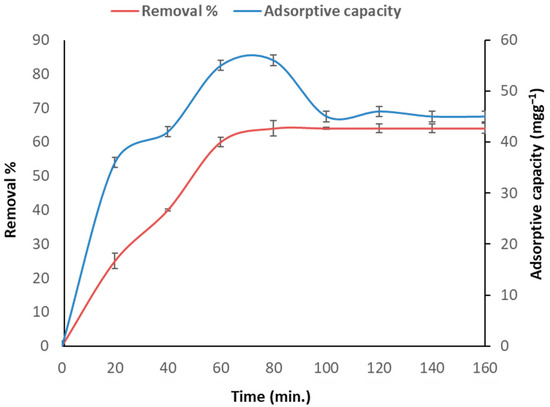 Figure 2 shows the bio-adsorptive capacity and removal percentage of As (III) onto the surface of C. vulgaris at various contact times (20, 40, 60, 80, 100, 120, 140, and 160 min). After 76 min of bio-adsorption, C. vulgaris’ uptake of As (III) ions reached an equilibrium. The time it takes for heavy metals in a solution to reach a constant value is known as the adsorption equilibrium time. The maximum bio-adsorption rate for As (III) uptake was 55 mgg−1 and the removal percentage was 64%. According to a similar study, a rapid absorption rate was followed by a slower rate and, eventually, an equilibrium [37]. The rate of metal removal was initially rapid due to the abundance of binding sites on the biomass surface, which eventually became saturated. The rapid uptake of As (III) by the biomass binding sites demonstrated an adsorption process with no energy-mediated reactions occurring via surface binding. Due to the rapid metal bio-adsorption, the application was simplified and more efficient.