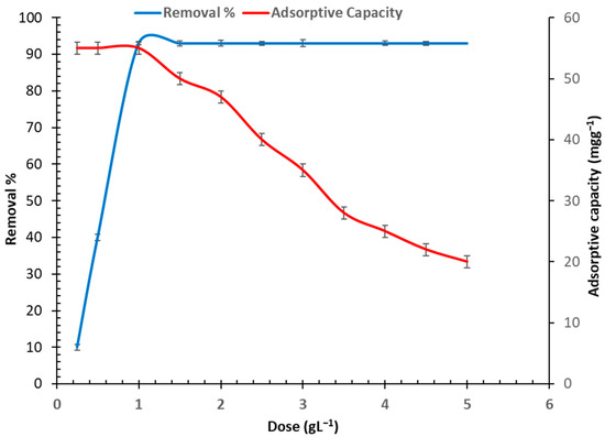 The results depicted in Figure 3 show that increasing the bio-adsorbent dose from 0.25 to 1 gL−1 led to a rise in the As (III) ion removal percentage, from 8 to 100%. The removal percentage remained unchanged after the concentration reached 1 gL−1. In contrast, increasing the bio-adsorbent dosage between 1 and 5 mgg−1 reduced the bio-adsorption rate from 55 to 20 mgg−1. Consequently, the optimal bio-adsorbent dose was found to be 1 gL−1, with the highest rate of arsenic bio-adsorption by C. vulgaris being 55 mgg−1 and removal percentage of 93%. It should be noted that the adsorption rate decreased as the adsorbent dose increased due to the initial metal ion concentration being insufficient to match all the active sites on the adsorbent’s surface. This was an indicator of the attraction between the functional groups present on the adsorbent’s surface and the arsenic particles [38,39].