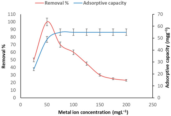 As (III) bio-adsorption percentages at various metal ion concentrations. The biomass dose was 1 gL−1, the pH was 6.0, and the contact period was 76 min.
