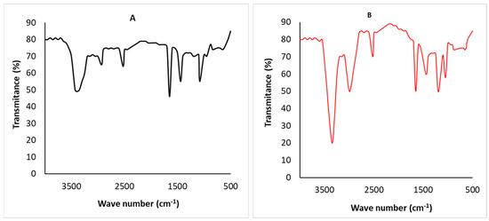 FTIR spectra of (A) untreated arsenic biomass as a blank sample and (B) arsenic-treated biomass.