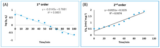 (A) Pseudo-first-order and (B) pseudo-second-order kinetics of As (III) bio-adsorption at pH 6, 50 mgL−1 arsenic, 1 gL−1 bio-adsorbent, and 1 g bio-adsorbent.