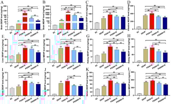 Han, J.; Yan, J.; Li, K.; Lin, B.; Lai, W.; Bian, L.; Jia, R.; Liu, X.; Xi, Z. Distribution of Micro-Nano PS, DEHP, and/or MEHP in Mice and Nerve Cell Models In Vitro after Exposure to Micro-Nano PS and DEHP. Toxics 2023, 11, 441. https://doi.org/10.3390/toxics11050441
