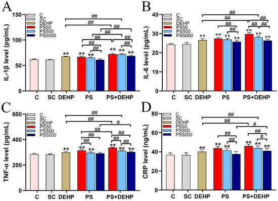 3.5. Combined Exposure to PS and DEHP Induces Systemic Inflammation