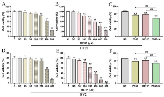 3.6. Effects of PS50 and MEHP Exposure Alone and in Combination on the Viability of HT22 and BV2 Cells