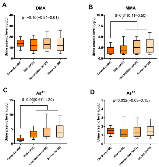 Comparison of DMA, MMA, As3+ and As5+ in the subjects between different groups. (A) The difference in DMA levels for different severities of arsenicosis; (B) The difference in MMA levels for different severities of arsenicosis; (C) The difference in As3+ levels for different severities of arsenicosis; (D) The difference in As5+ levels for different severities of arsenicosis. Each box represents the interquartile range, and the whiskers represent the 10th and 90th percentiles. * represents p-trend < 0.05. The p value was calculated using a general linear-by-linear model for the differences between groups adjusted for age, gender, BMI, smoking, and alcohol usage.