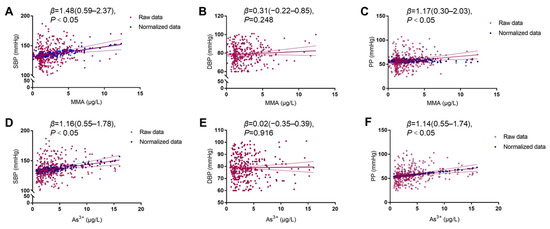 Association of MMA with SBP (A), DBP (B), and PP (C), and As3+ with SBP (D), DBP (E), and PP (F). In the scatter plots, the red plots represent the raw data, and the normalized data are represented as the blue plots after adjusting for age, gender, BMI, smoking, and alcohol usage. The multivariable linear regression model calculated the p value and fitted curves.