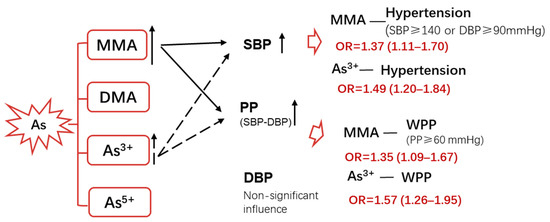 In this study, we focus on the four main chemical forms formed during the metabolism of inorganic arsenic after it enters the body (MMA, DMA, As3+, and As5+). The data show that in an arsenicosis population, urinary MMA and As3+ levels correlate with increasing SBP and PP values and are positively associated with hypertension and WPP in the population. Briefly, it was found that coal-burning arsenic exposure may be related to hypertension and WPP incidences by inducing higher SBP and PP levels (Figure 3).