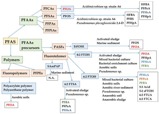 Research of PFAS biodegradation/transformation/defluorination was conducted under different operating conditions with different microorganisms (Figure 1) and resulted in different products and process efficiencies [,,].
