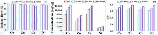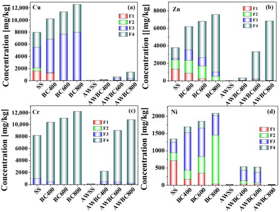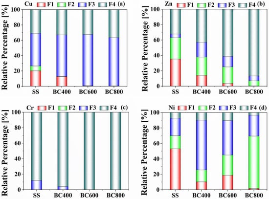 3.2.2. Speciation of Heavy Metals in the SS and Its Biochars