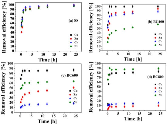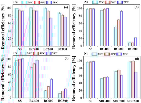 3.3.4. Effect of Washing Temperature on the Removal Efficiency of Heavy Metals