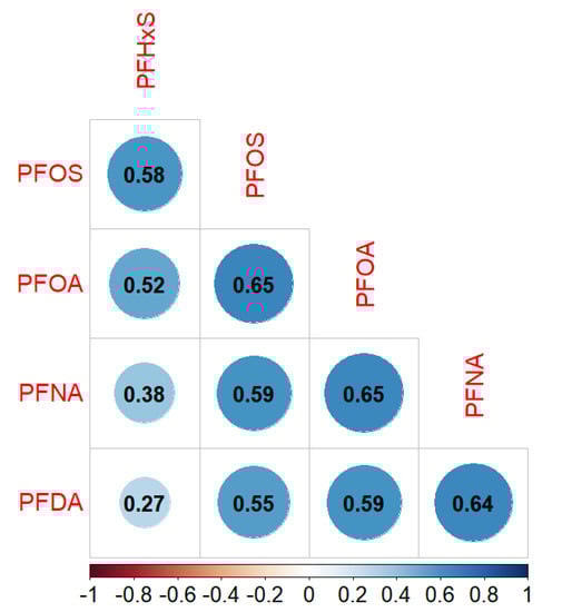 All statistical analyses were conducted using R 4.0.2. We used Spearman correlation coefficients to examine the pairwise correlations between PFAS. Maternal plasma PFAS concentrations were log2-transformed to diminish the effect of extreme values.