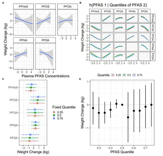 Pre-pregnancy BMI may be an effect modifier of the association between prenatal PFAS and postpartum weight change []. We included pre-pregnancy BMI in the kernel function with the PFAS to assess potential interactions between them. We also stratified our analyses based on the pre-pregnancy BMI categories (healthy/underweight BMI < 25 kg/m2, overweight/obese BMI ≥ 25 kg/m2) and built BKMR models for each stratum. In the linear regression models, we included interaction terms between individual PFAS and binary pre-pregnancy BMI (healthy/underweight vs. overweight/obese) to evaluate potential effect modification by pre-pregnancy BMI.