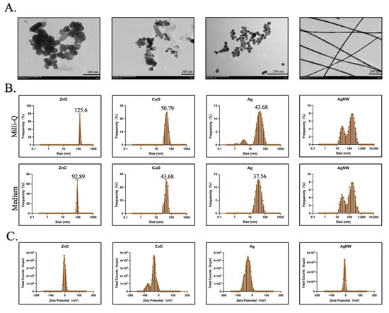 The hydrodynamic size distribution of the ZnO, CuO, Ag, and AgNW nanomaterials was evaluated by dynamic light scattering (DLS) analysis using a Malvern Zetasizer Pro (Malvern Zetasizer Pro, Worcestershire, UK). The hydrodynamic behavior was assessed by dispersing these NMs (final concentration, 100 µg/mL) in Milli-Q (mQ) water and medium. At least three biological replicates were examined for each experiment.