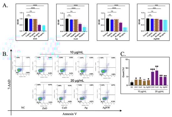 Cytotoxicity and apoptosis detection in HK-2 cells treated with the four types of metallic nanomaterials. (A) Cell cytotoxicity was tested using CCK8 assay. HK-2 cells were treated with ZnO, CuO, Ag, and AgNW at 5, 10, 15, and 20 μg/mL for 24 h, respectively. The data were presented as a mean ± SEM of three independent experiments. * p < 0.05, ** p < 0.01, *** p < 0.001, **** p < 0.0001, ns > 0.05 with respect to the control based on one-way ANOVA. (B) Representative FACA scatter plots of apoptosis for HK-2 cells were treated with 10 μg/mL of ZnO, CuO, Ag, and AgNW relative to untreated HK-2 cells using Annexin V-PE staining. The control group was treated with 20 μg/mL of NMs. Experiments were performed in biological triplicates. (C) Statistical analysis of the percentage of apoptotic cells in HK-2 cells treated with different nanomaterials concentrations. Averaged data from Annexin V-FITC assay showing the ability to induce apoptosis. * p < 0.05, ** p < 0.01, *** p < 0.001 vs. NC.