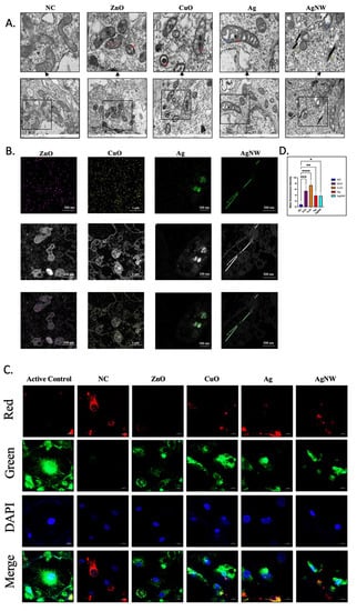 Studies have shown that metallic NMs may cause mitochondrial dysfunction, leading to morphological changes, increased reactive oxygen species (ROS) production, decreased mitochondrial membrane potential, and inhibition of enzyme activities, electron transport chains, and cellular respiration, leading to cell apoptosis and necrosis [,,]. We explored whether the damage caused by metal NMs was reflected in organelles at sublethal concentrations before cell death. Mitochondria, which are the organelles most sensitive to external changes, were the key focus of our research. First, we investigated whether sublethal concentrations of metallic NMs caused mitochondrial structural changes using TEM imaging (Figure 3A). After 24 h of exposure to metallic NMs, treated HK-2 cells showed that the matrix of mitochondria formed spheres in the ZnO- and CuO-treated groups (marked by a red box) and formed partial cavities in the Ag- and AgNW-treated groups (blue arrow), which could be because of cristolysis and a lack of cristae. Similar results have previously shown that metal NMs can induce a series of morphological changes in the mitochondria of mouse liver cells []; however, the effect of sublethal concentrations on the mitochondrial structure in HK-2 cells is unclear. In addition, treated HK-2 cells showed mitochondrial membrane shrinkage in all treatment groups. Surprisingly, the ZnO, CuO, and AgNMs were also detected in the mitochondria (red arrow), and the AgNWs were observed in the cytoplasmic matrix (green arrow). NMs enter cells and organelles and affect their functions. We have performed an energy spectrum test. As revealed by transmission electron microscope, ZnO, CuO, and Ag nanomaterials experimental groups, respectively detected the clear distribution of Zn, Cu, and Ag signals in mitochondrial organelles, demonstrating that metal nanomaterials enter mitochondria under sublethal concentration. It is worth noting that AgNWs are still located in the cytoplasm. It might have something to do with its length (Figure 3B). JC-1 was used to stain the mitochondria to indicate mitochondrial membrane potential. Thus, a shift in fluorescence from red to green indicates a decrease in the mitochondrial membrane potential. After 24 h of exposure, we evaluated the mitochondrial membrane potential using confocal microscopy (Figure 3B). HK-2 cells treated with metallic NMs at a concentration of 10 μg/mL showed an increase in green fluorescence compared with untreated HK-2 cells, especially HK-2 cells exposed to ZnO and CuO. The ratio between green and red fluorescence also showed that 10 μg/mL of ZnO and CuO had a greater influence on the mitochondrial membrane potential than the other concentrations (Figure 3C). Overall, our findings indicated that sublethal doses of 10 μg/mL were able to produce mitochondrial damage in HK-2 cells leading to minor levels of cell death. In addition, HK-2 cells treated with 10 μg/mL of ZnO and CuO cause stronger mitochondrial damage than Ag and AgNW treatments.