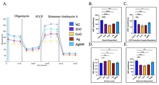 Mitochondrial energy metabolism assay. (A) Bioenergetic profiles of HK-2 cells treated with 10 μg/mL of ZnO, CuO, Ag, and AgNW measured by Seahorse XF96. (B–E) Mitochondrial OXPHS were analyzed based on basal respiration, ATP production, proton leak, and maximal respiration for HK-2 cells treated with ZnO, CuO, Ag, and AgNW nanomaterials. * p < 0.05, ** p < 0.01, *** p < 0.001, **** p < 0.0001, ns > 0.05 with respect to control based on one-way ANOVA.