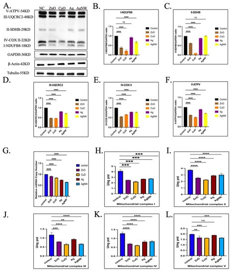 Activities of mitochondrial complexes assay. (A) Western blot analysis of HK-2 cells upon exposure to 10 μg/mL of the four types of metallic nanomaterials for 24 h. (B–F) The band density ratio of NDUFB8, SDHB, UQCRC2 COXII, and ATPV to GAPDH in the Western blots was quantified by densitometry. (G) Analysis of mtDNA expression for HK-2 cells exposed to metallic nanomaterials for 24 h (n = 3). (H–L) The activity of the mitochondrial respiration chain complexes I to V was tested using a detection kit after the HK-2 cells were treated with the four types of metallic nanomaterials for 24 h. The NADH oxidation rate was measured at 340 nm using the plate reader. ** p < 0.01, *** p < 0.001, **** p < 0.0001, ns > 0.05 with respect to the control based on one-way ANOVA.