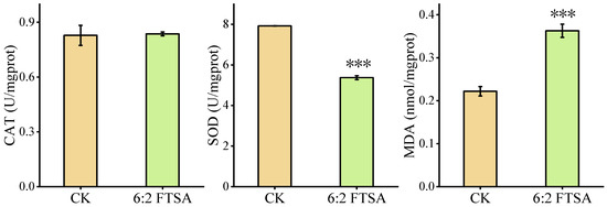 Effect of 6:2 FTSA exposure on CAT and SOD activities and MDA content in zebrafish. Data expressed as the mean ± standard deviation. Asterisks indicate significant differences between the exposure and control groups: *** p < 0.001. CK = control group; prot = protein; U = active unit.