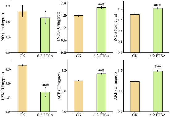 Effect of 6:2 FTSA exposure on TNOS, iNOS, LZM, AKP and ACP activities, and NO content in zebrafish embryos. Data expressed as the mean ± standard deviation. Asterisks indicate significant differences between the exposure and control groups: *** p < 0.001. CK = control group; prot = protein; U = active unit.