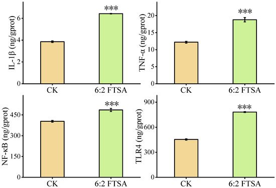 Effect of 6:2 FTSA exposure on IL-1β, TNF-α, NF-κB and TLR4 protein expression in zebrafish embryos. Data expressed as the mean ± standard deviation. Asterisks indicate significant differences between the exposure and control groups: *** p < 0.001. CK = control group; prot = protein.