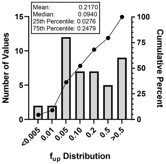 Experimental fup values were derived for 43 PFAS. Values ranged from a minimum fup of 0.004 for 1,6-dibromododecafluorohexane (DTXSID20335129) to 1 for 2-aminohexafluoropropan-2-ol (DTXSID80382093), with the 25th percentile and median values of 0.0276 and 0.0940, respectively (Figure 1). Comparing the median to an average fup of 0.2170 demonstrates that the data were skewed toward being more highly bound, despite the range of binding noted across the larger dataset. Furthermore, comparing the median values for this set (fup = 0.0940) with a second set of PFAS comprised primarily of perfluoroalkyl acids evaluated elsewhere (fup = 0.005) [], these PFAS exhibited on average a 20-fold lower binding.