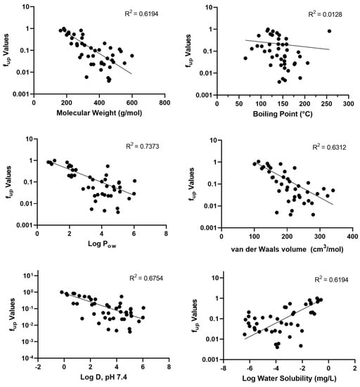 Six physicochemical properties and the experimental fup data were evaluated using nonlinear regression for trends (Figure 2). Lower fup values (i.e., higher binding) were reasonably correlated with increases in molecular weight (r2 = 0.6194), Log Pow values (r2 = 0.7373), van der Waals volumes (r2 = 0.6312), and Log D at pH 7.4 (r2 = 0.6754). Alternately, higher fup values were correlated with an increase in water solubility (r2 = 0.6194). No apparent trend emerged for boiling points.