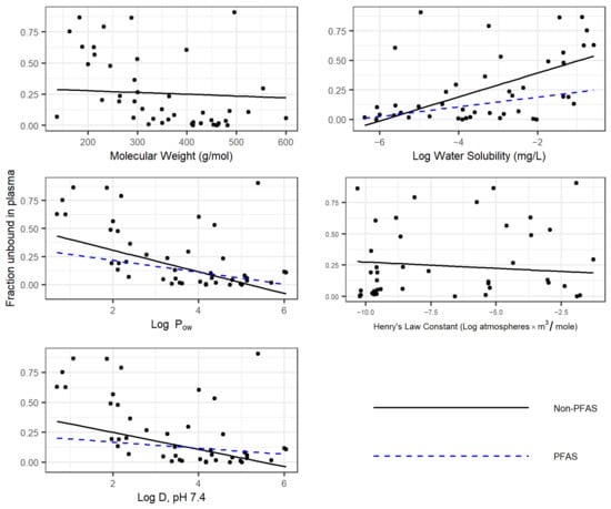 To evaluate whether PFAS physicochemical property PPB trends varied significantly from other chemicals, experimental fup data were collected on (1) 1681 non-PFAS chemicals collected from the literature and present in R package “httk” []; (2) 114 PFAS (those evaluated here, in separate effort [], and already present in R package “httk”; and (3) the 43 PFAS measured in this effort. For each set, the dependence of fup on physicochemical properties was determined, and differences between the three sets were evaluated (Figure 3). For each property, a separate multivariate linear regression was performed for the measured fup on the property and two set identifiers. The identifiers were yes/no factors indicating whether each compound was a PFAS and whether it was newly measured here. Statistical significance testing on the relationship between fup and the property and any interactions with the set identifiers was performed using R function “lm”. For Log Pow, water solubility (LogWSol) and LogD74 (Log D at pH 7.4), a statistically significant different trend was observed for PFAS vs. non-PFAS chemicals, as evidenced by the blue line. No differences were observed for molecular weight or Henry’s Law constant. Moreover, in no cases were different trends observed between the 43 PFAS from this study and the 71 other PFAS.