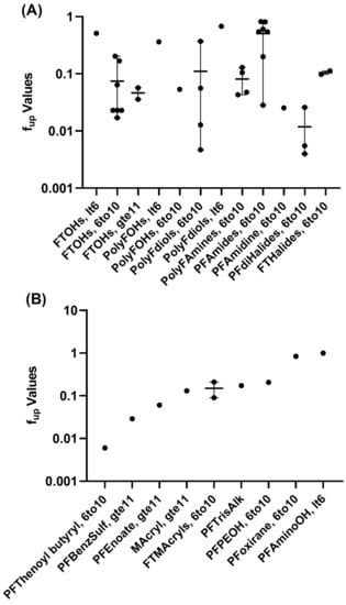 Overall, 21 different functional categories were evaluated for plasma protein binding, with no strong, category-specific trends emerging (Figure 2). The perfluorodihalide group, defined as having a non-fluorine halide substitution group, exhibited the highest binding (mean fup = 0.012). The lowest fup (of 0.004) was observed for 1,6-dibromododecafluorohexane (DTXSID20335129). Fluorotelomer halides exhibited less binding on average (mean fup = 0.11), which is consistent with the higher binding noted in other per- vs. polyfluoroalkyl substance comparisons []. Other than their use as an intermediate in chemical synthesis and as a precursor to the formation of other PFAS, little else is known about the commercial use or environmental fates of these PFAS [,]. Several PFAS alcohols were evaluated: two polyfluorinated diols exhibited high binding (fup ≤ 0.01), but as a group, the binding for the four evaluated ranged from 0.005 to 0.6770. Six FTOHs, with a minimum of six carbons, exhibited varied binding (fup 0.02–0.5). Increased detection of FTOHs in commercial products and in indoor air has heightened the need for more information on this set of PFAS [,].