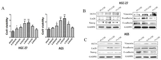 Cigarette smoke promotes EMT and stemness of gastric cancer cells. Gastric cancer cells (HGC-27 and AGS) were treated with cigarette smoke extract for 4 days. (A) Effects of different concentrations of cigarette smoke extract on the activity of gastric cancer cells. (B,C) Protein expression of stemness and EMT markers in gastric cancer cells after cigarette smoke extract exposure. * p < 0.05, ** p < 0.01.