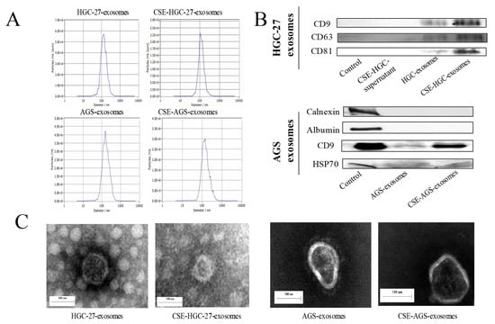 Effect of cigarette smoke on exosomes of gastric cancer cells. Gastric cancer cell exosomes were extracted before and after cigarette smoke exposure. (A) Detection of exosomes with a nanoparticle tracking analyzer. (B) Exosome-labeled proteins such as CD9, CD63, CD81, Calnexin, Albumin and HSP70 were detected using Western blotting. (C) The morphology of exosomes before and after cigarette smoke extract treatment were observed using transmission electron microscopy.