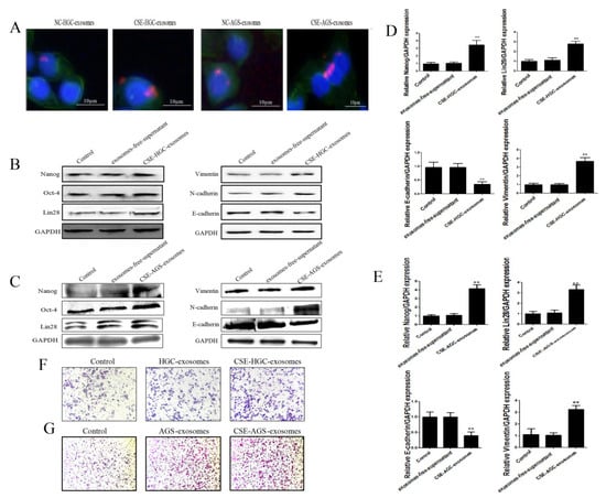 Cigarette smoke-induced exosomes promote the stemness and EMT of GES-1 cells. Cigarette smoke-induced GC cell exosomes were administered to GES-1 cells for 4 days. (A) Exosomes of gastric cancer cells were taken up by GES-1 cells. (B,C) Effect of cigarette smoke-induced exosomes on the protein levels of stemness and EMT markers. (D,E) Effect of cigarette smoke-induced exosomes on stemness and EMT marker mRNA expression. (F,G) Cigarette smoke-induced exosomes promoted GES-1 cell migration. ** p < 0.01.