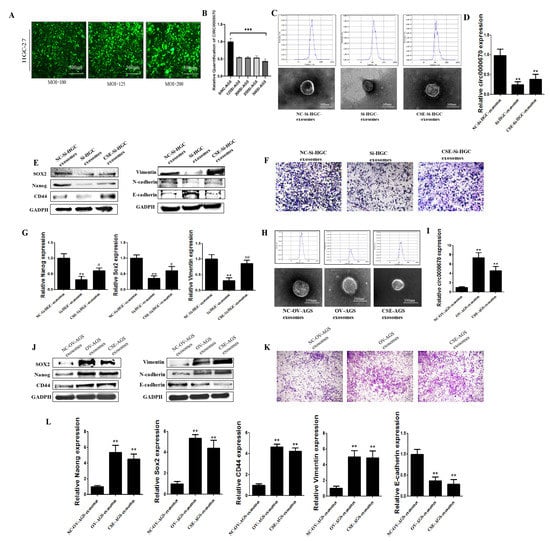 Exosomes carry noncoding RNA, protein and other molecules to participate in cell communication and have a critical role in gastric cancer and other cancers [,]. The abnormal expression of circRNAs is closely related to the occurrence and development of gastric cancer [,,]. It was found that cigarette smoke affects circRNAs and other noncoding RNAs transported by exosomes and plays a role in the occurrence and development of diseases [,,]. In the current study, we investigated whether cigarette smoke promotes gastric cancer by affecting the components carried by exosomes, such as circRNA. We first screened and verified abnormally expressed circRNAs from the GEO database (GSE83521 and GSE93541) and tissues of gastric cancer patients with a smoking history. The results indicated that circ0000670 is highly expressed in the tissues of gastric cancer patients with a smoking history. Liu et al. also reported that circ0000670 plays an important role in the development of gastric cancer [], but its role in cigarette smoke-induced gastric cancer and the effects of cigarette smoke-induced gastric cancer cell exosomes on the fate of surrounding normal cells was not clear. Our results showed an increasing trend in 40 gastric cancer patients with a smoking history (85%). We also found that cigarette smoke promoted the expression of circ0000670 in gastric cancer cells (HGC-27 and AGS) and associated exosomes (Figure 4). To study the role of exosomal circ0000670 in promoting the stemness and EMT of GES-1 cells, we commissioned a biological company to construct circ0000670 knockdown and overexpression lentivirus vectors. In further experiments, circ0000670 knockdown and overexpression lentivirus vectors were transferred into cigarette smoke-treated gastric cancer cells, and the expression of circ0000670 in gastric cancer cell exosomes was detected. We found that the augmenting effect of gastric cancer cell exosomes on the stemness and EMT of GES-1 cells was inhibited by the knockdown of circ0000670 (Figure 5C–G). In contrast, the results showed that gastric cancer cell exosomes of the circ0000670-overexpressing group could promote the stemness and EMT of GES-1 cells (Figure 5H–L).