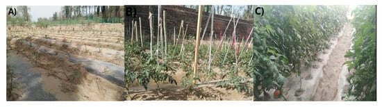 Different stages of tomato growth. (A) Seedling stage, (B) flowering and fruiting stage, and (C) mature stage.
