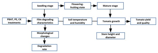 The PBAT and PE films were soaked in 75% ethanol for 0.5 h, rinsed with distilled water 3 times, and put in an air-drying oven for 24 h at 60 °C before SEM analysis. A scanning electron microscope (Zeiss Super 55VP, Oberkochen, Germany) was used for analyzing the morphological changes on the surface of the PBAT and PE film samples. A flowchart showing the treatments and measurements is given in Figure 2.