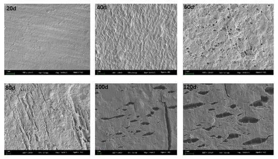 Figure 4 shows the microscopic morphological changes in the PBAT film after degradation at different stages. It can be seen from the SEM photos that the PBAT film surface was still intact and smooth without any cracks after 20 days of coverage. After 40 days of coverage, irregular bumps and depressions appeared on the surface, but the surface remained intact without any holes or cracks. After 60 days, a large number of small holes and cracks appeared on the surface of the PBAT film, indicating the induction period of the PBAT film. After 80 days, many strip-like cracks appeared on the surface, which further expanded after 120 days, hinting at an acceleration in the degradation process. It is also obvious from Figure 4 that the degradation process on the film surface was uneven, which could be attributed to the inconsistent degradation rate of BA and BT components in the PBAT film structure []. In contrast, the surface morphology of the PE mulch did not change significantly, which is consistent with surface observations of PE mulch, indicating that the PE mulch was not degraded significantly during the entire growth period.