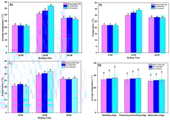 Change in soil temperature at different growth stages and different time periods. (A) Seedling stage, (B) flowering and fruiting stage, (C) mature stage, and (D) daily average temperature. The a and b symbols indicate the significance of the difference.