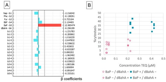 Cytostasis induction assessed with the CBPI on AGS cells, (A) graph representation of the effects, on right axis, value of the coefficients β, principal effects bi and binary interactions affects bij on the left, the dotted lines indicate the limits of significance, in blue the effects were not significant, in red the effects were significant; (B) %cytostasis of the 22 mixtures plotted against their Toxic Equivalent Quantity (TEQ) concentration, in blue the mixtures with high concentrations of BaP and in pink, mixtures with low concentrations of BaP.