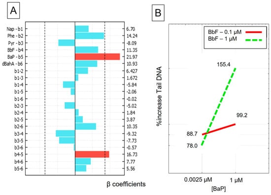 DNA damage assessed by the comet assay on AGS cells, (A) graphic representation of effects, on right axis, value of the coefficients β, principal effects bi and binary interactions affects bij on the left, the dotted lines indicate the limits of significance, in blue the effects were not significant, in red the effects were significant; (B) graphic representation of the binary interaction effect between BaP and BbF, concentrations on the X axis and %increaseTailDNA on the Y axis, BbF at 0.1 µM is represented by the solid red line and BbF at 1 µM is represented by the dotted green line.