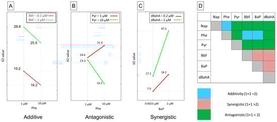 - Staal, Y.C.M.; Hebels, D.G.A.J.; van Herwijnen, M.H.M.; Gottschalk, R.W.H.; van Schooten, F.J.; van Delft, J.H.M. Binary PAH Mixtures Cause Additive or Antagonistic Effects on Gene Expression but Synergistic Effects on DNA Adduct Formation. Carcinogenesis 2007, 28, 2632–2640. [Google Scholar] [CrossRef]