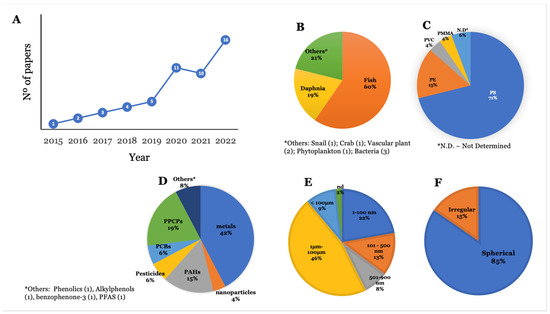 Figure 2A depicts the number of publications considered in this review per year of publication. It clearly shows an increase in the number of studies considering the influence of NMPs on the bioaccumulation of environmental contaminants. The advances in analytical chemistry and NMP characterization techniques have contributed to this increase regarding the quantification of contaminants in the animals’ tissue and exposure media [23,24,25]. Fish are the most studied group of animals within this subject (60%), with Danio rerio being the most studied species (Figure 2B). Daphnia magna is the second most used species to assess the influence of NMPs on the bioaccumulation of contaminants. Other species used were unicellular algae, freshwater crabs and snails, bacteria, protozoa, and vascular plants [26,27,28,29,30,31,32,33,34,35] (Figure 2B). As for the polymer type, polystyrene (PS) is the most studied polymer (70%), as it also stands as the third most abundant polymer in the environment, after polyethylene (PE) and polypropylene (PP) (Figure 2C) [36], which gives it an environmental relevance. Following PS, PE is the second most used polymer (15%) for investigating the influence of NMPs on the bioaccumulation of contaminants. Other types of polymers used were poly(methyl methacrylate) (PMMA) and polyvinyl chloride (PVC), whereas 6% of the studies did not specify the type of polymer applied (Figure 2C).