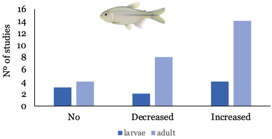 Out of the 29 studies considered, Danio rerio (zebrafish) is the most studied species, presented in 70% of the studies that employed fish as a model species. Other species used to assess the influence of NMPs on the bioaccumulation of contaminants were Carassius auratus (n = 1) [38], Oreochromis niloticus (n = 3), [39,40,41], Misgurnus anguillicaudatus (n = 1) [42], Symphysodon aequifasciatus (n = 1) [43], and Cyprinus carpio (n = 1) [44], and one study used in vitro gut sacs of rainbow trout Oncorhynchus mykiss [45]. In all studies with fish, water was the exposure route used, except for one study that employed dietary exposure to assess the trophic transfer of benzo(k)fluoranthene (bkf) [37]. Metals were the most studied group of contaminants (45%) and, among organic compounds, PPCPs were presented in most studies (25%). In half of the experiments (54%), the presence of NMPs increased the bioaccumulation of other contaminants, while in 22.5% of studies, NMPs decreased bioaccumulation; 25% indicated that the presence of NMPs did not influence bioaccumulation. Overall, the presence of NMPs increased the bioaccumulation of organic compounds and metals in fish in 58% and 42% of studies, respectively. There was also a tendency for a developmentally related influence of NMPs on bioaccumulation, as shown in Figure 3, where the decrease and increase are most often observed in adult fish, in relation to larvae.