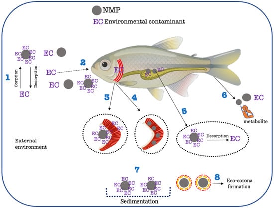 Simplified scheme of possible interactions between environmental contaminants (ECs) and NMPs in a freshwater environment and within a fish organism. 1—Sorption/desorption of EC onto NMPs. 2—Oral uptake (via water or food) of ECs, NMPs, and ECs adsorbed onto NMPs. 3—Uptake of ECs via gills (either dissolved or adsorbed onto NMPs, carrier effect). The size of NMPs is important to whether NMP internalization will occur. For larger particles, bioavailability will decrease, and direct uptake through gills will be lower. 4—Uptake of NMPs via gills. In this case, NMPs clothe gill membranes, decreasing the uptake of ECs. 5—Sorption/desorption of ECs onto NMPs in the gastrointestinal tract after oral ingestion. The internal environment of the gastrointestinal tract can favour the desorption of contaminants and their blood distribution through the body. 6—Excretion/Egestion of ECs and/or metabolites favoured by the presence of NMPs. This is one of the explanations for lowered bioaccumulation of ECs in the presence of NMPs. 7—Sedimentation of NMPs loaded with ECs. In this case, the EC becomes less available, and uptake and bioaccumulation of the substance decrease. 8—Formation of a layer of organic matter around the NMPs, designated by Eco-corona. Eco-corona formation may induce faster sedimentation, impacting environmental fate and bioavailability of NMPs.