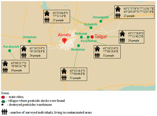 The collection of biomaterials (peripheral blood samples, samples of food products of plant and animal origin) was carried out in 5 settlements of the Talgar region (Beskaynar, Kyzylkairat, Amangeldy, Belbulak, and Enbekshi settlements) in the period of 2018–2021 years and in 2 settlements of the Dzhambyl region (Karakastek and Umbetaly settlements) in 2021. The burials of obsolete, non-utilized pesticides were found on the territory of each selected village.