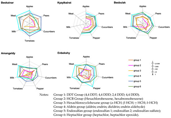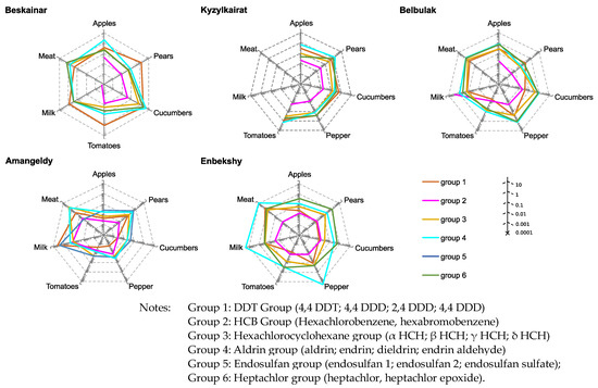 To simplify the risk assessment, all pesticides that were detected in food products were divided into six groups depending on the chemical structure of the active POPs: (1) DDT group (4.4 DDT; 4.4-DDD; 2.4-DDD; 4.4-DDD); (2) HCB group (hexachlorobenzene, hexabromobenzene); (3) hexachlorocyclohexane group (α-HCH, γ-HCH, β-HCH, δ-HCH); (4) aldrin group (aldrin, endrin, deleldrin, endrin aldehyde); (5) endosulfan group (endosulfan 1, endosulfan 2, endosulfan sulfate); and (6) heptachlor group (heptachlor, heptachlor epoxide).